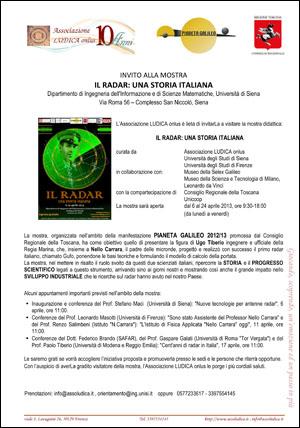 Sarà inaugurata il 6 aprile, alle ore 11.00, presso il dipartimento di Ingegneria dell'informazione e scienze matematiche, la mostra "Il radar, una storia italiana", promossa dal Consiglio regionale della Toscana: in questa occasione il professor Stefano Maci terrà una conferenza sul tema "Nuove tecnologie per antenne radar".