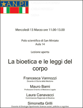 Il 13 marzo, dalle 11 alle 13, presso l'aula 14 del Polo scientifico di San Miniato, si terrà la lezione aperta "La bioetica e le leggi del corpo", a cura del Circolo Anpi universitario "Carlo Rosselli".