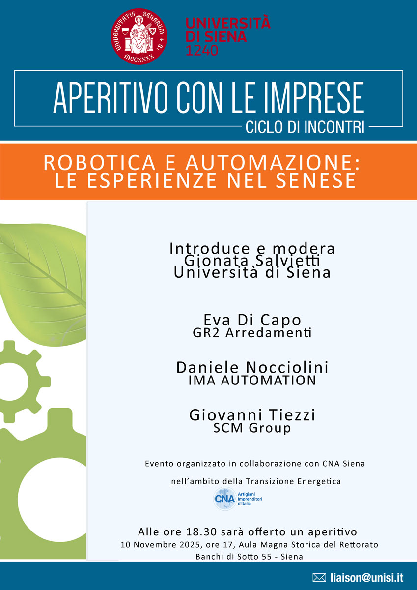 Il giorno 10 novembre, alle ore 17, nell’Aula Magna Storica del Rettorato (Banchi di Sotto 55 – Siena), si terrà l’incontro "Robotica e automazione: le esperienze nel senese", nell’ambito del ciclo di appuntamenti “Aperitivo con le imprese”