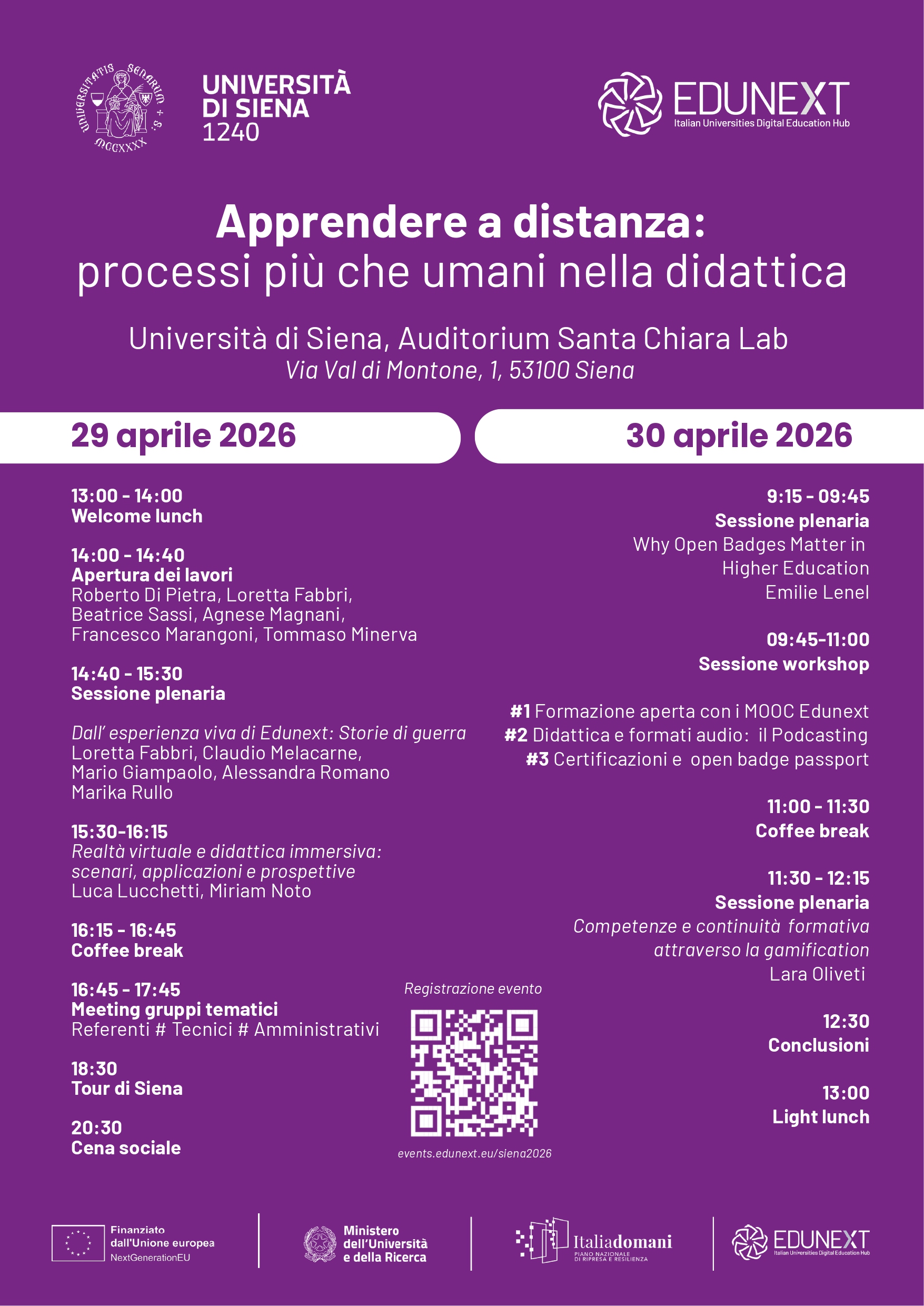 Dal 29 al 30 aprile, nell’auditorium del Santa Chiara Lab (via Valdimontone, 1 – Siena), si terrà l’evento “Apprendere a distanza: processi più che umani nella didattica”, una due giorni di lavori dedicata a Edunext, l’hub strategico per l’innovazione del sistema universitario italiano che servirà a fare il punto sul futuro della formazione: tra realtà virtuale, podcasting e nuove frontiere del digital learning.