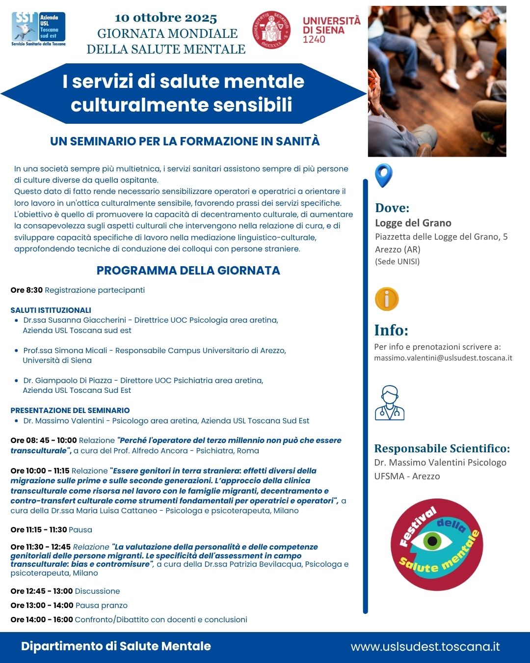Il 10 ottobre, a partire dalle ore 8.30, alle Logge del Grano di Arezzo, si terrà il seminario per la formazione in sanità "I servizi di salute mentale culturalmente sensibili".