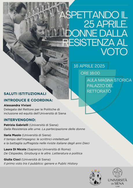 Il giorno16 aprile alle ore 16.00 presso l'Aula Magna Storica del Palazzo del Rettorato, l'Ateneo di Siena celebra il 25 aprile con un seminario dedicato alla storia delle donne ed al loro ruolo nella nascita della Repubblica. Quest'anno, con le studiose Patrizia Gabrielli, Laura Di Nicola, Giulia Cioci e Ilaria Muoio verranno esaminati i temi della partecipazione delle donne al primo voto, del ruolo svolto dalle intellettuali in quegli anni e dei movimenti per il suffragio femminile in Italia in un'ottica multidisciplinare. E' importante, infatti, continuare a riflettere sul contributo che le donne hanno dato alla nascita della nostra Repubblica, nella Resistenza, nella partecipazione al voto, nell'Assemblea costituente, contributo che è stato per lungo tempo sminuito e dimenticato. In quest'ottica, la scelta del seminario è quella di riconoscere il ruolo significativo che le discipline storiche e letterarie giocano nel rafforzare la consapevolezza del fondamento democratico delle nostre istituzioni.