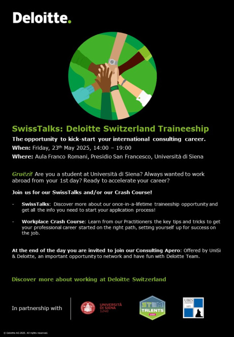Il Placement Office-Career Service organizza incontri informativi e selezioni (colloqui individuali, assessment, consegna CV, ecc...) rivolti alla comunità studentesca e a neolaureate/i dell’Università di Siena.