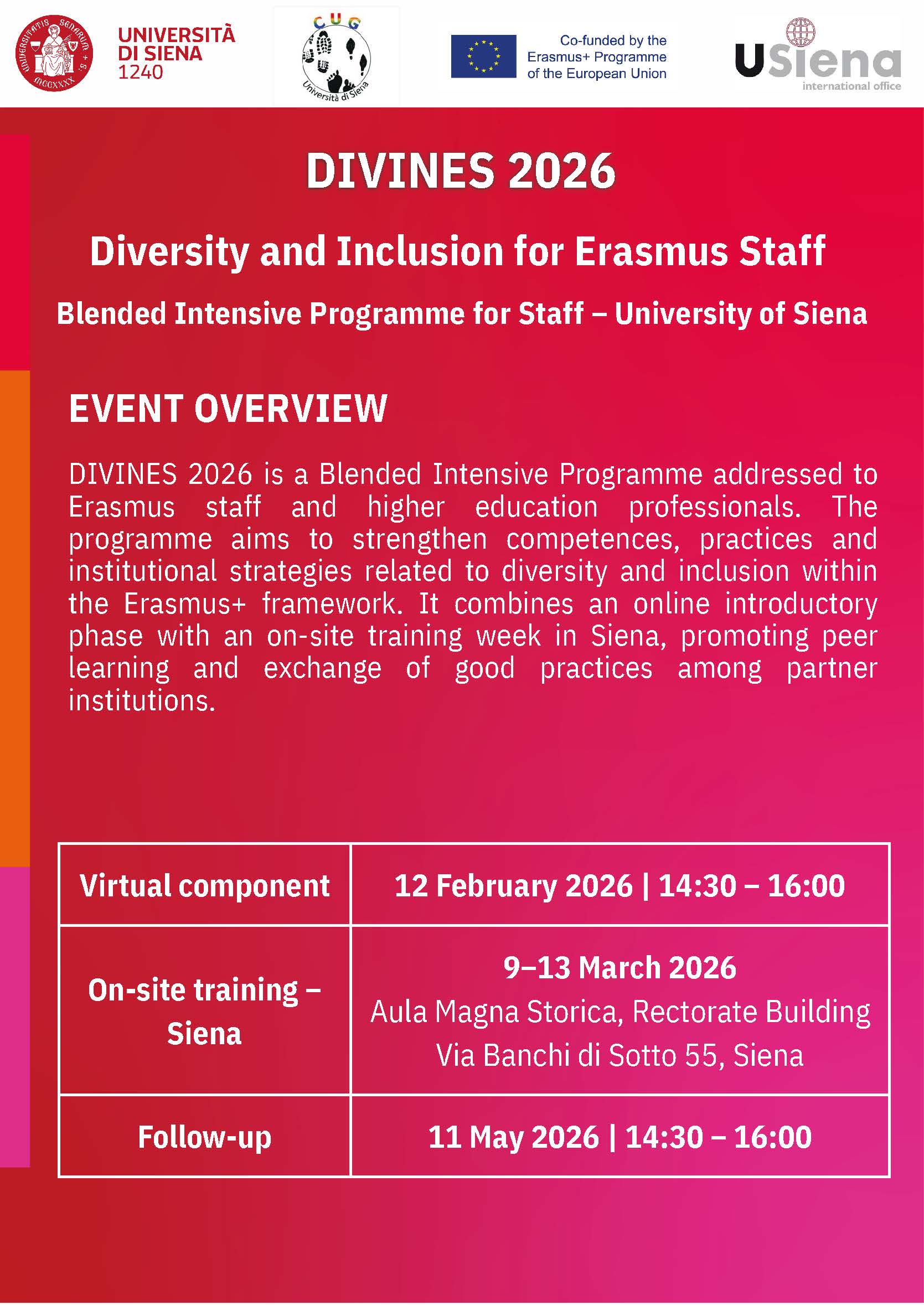 Il 9 marzo, a partire dalle ore 9:00, al Palazzo del Rettorato dell'Università di Siena, si terrà la seconda edizione del Blended Intensive Programme (BIP) Erasmus+ “DIVINES 2026 - Diversity and Inclusion for Erasmus Staff”. L'iniziativa è promossa dall'Ufficio Relazioni Internazionali in collaborazione con il CUG - Comitato Unico di Garanzia per le pari opportunità, la valorizzazione del benessere di chi lavora e della lotta alle discriminazioni.