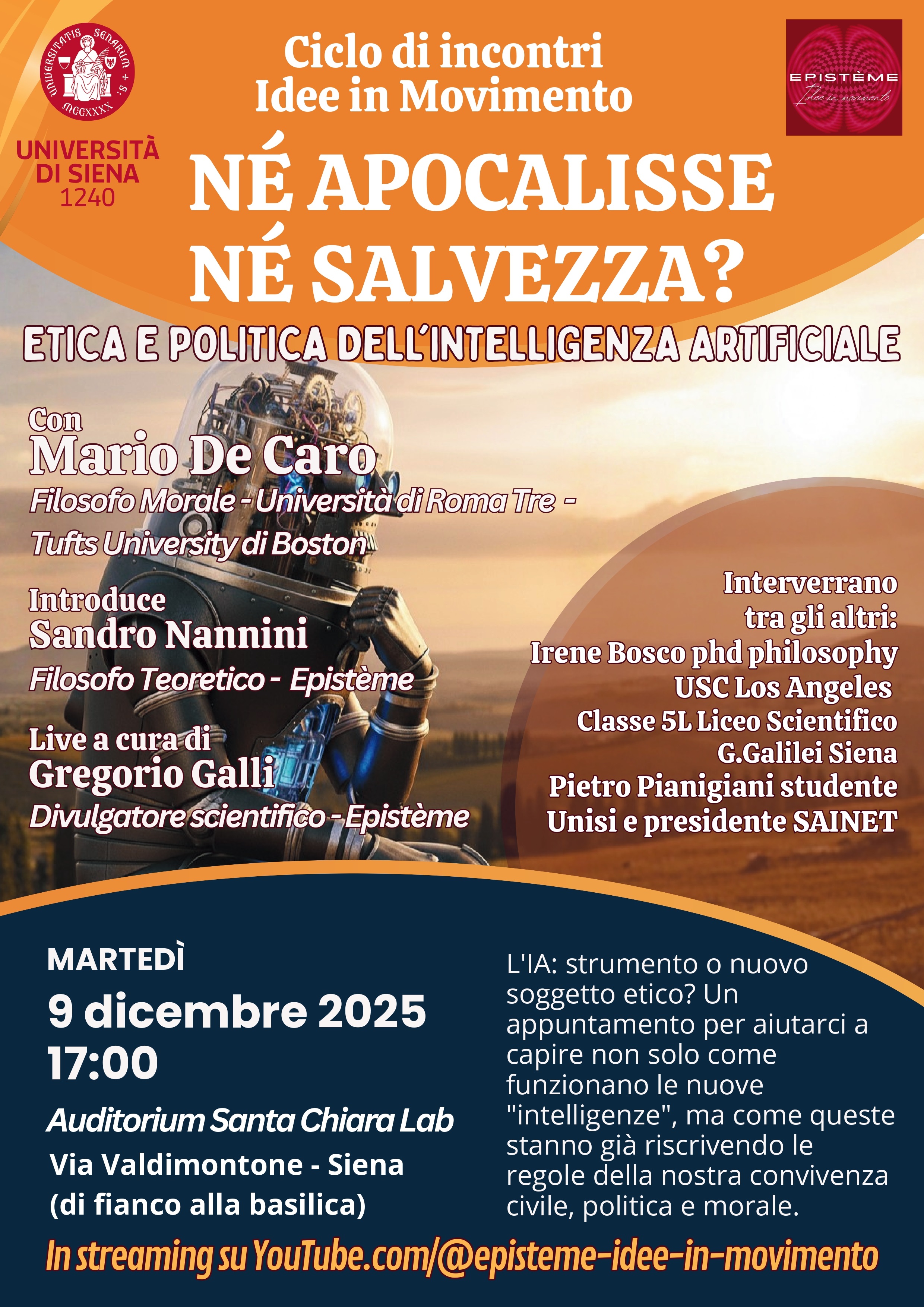 All’ingresso del Santa Chiara Lab saranno messe in vendita dalla Libreria Senese delle copie di un volume direttamente attinente al tema del dibattito: M. De Caro e B. Giovanola, Intelligenze. Etica e politica dell’IA, Il Mulino 2025