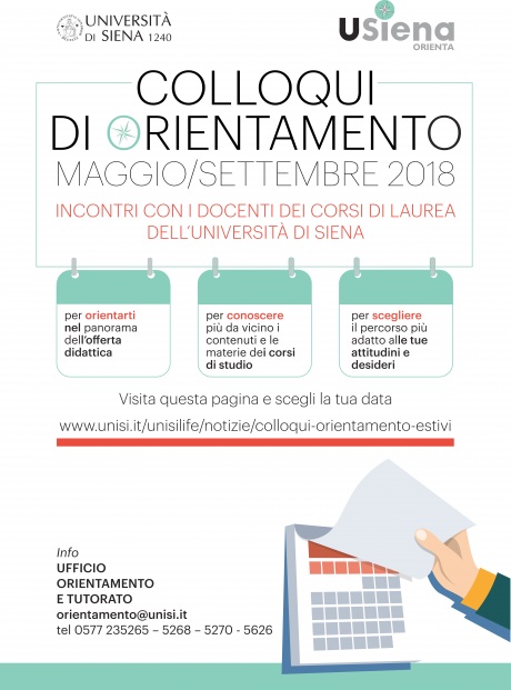 Pubblicato il calendario estivo dei colloqui di orientamento individuale: presso ogni dipartimento, per ciascun corso di studio, i docenti saranno disponibili per colloqui di orientamento secondo giorni e orari prestabiliti.