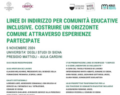 Il 5 novembre dalle ore 16, presso l'Aula Cardini della sede Mattioli dell’Università di Siena (via P.A. Mattioli 10), si terrà l'incontro "Linee di indirizzo per comunità educative inclusive. Costruire un orizzonte comune attraverso esperienze partecipate".