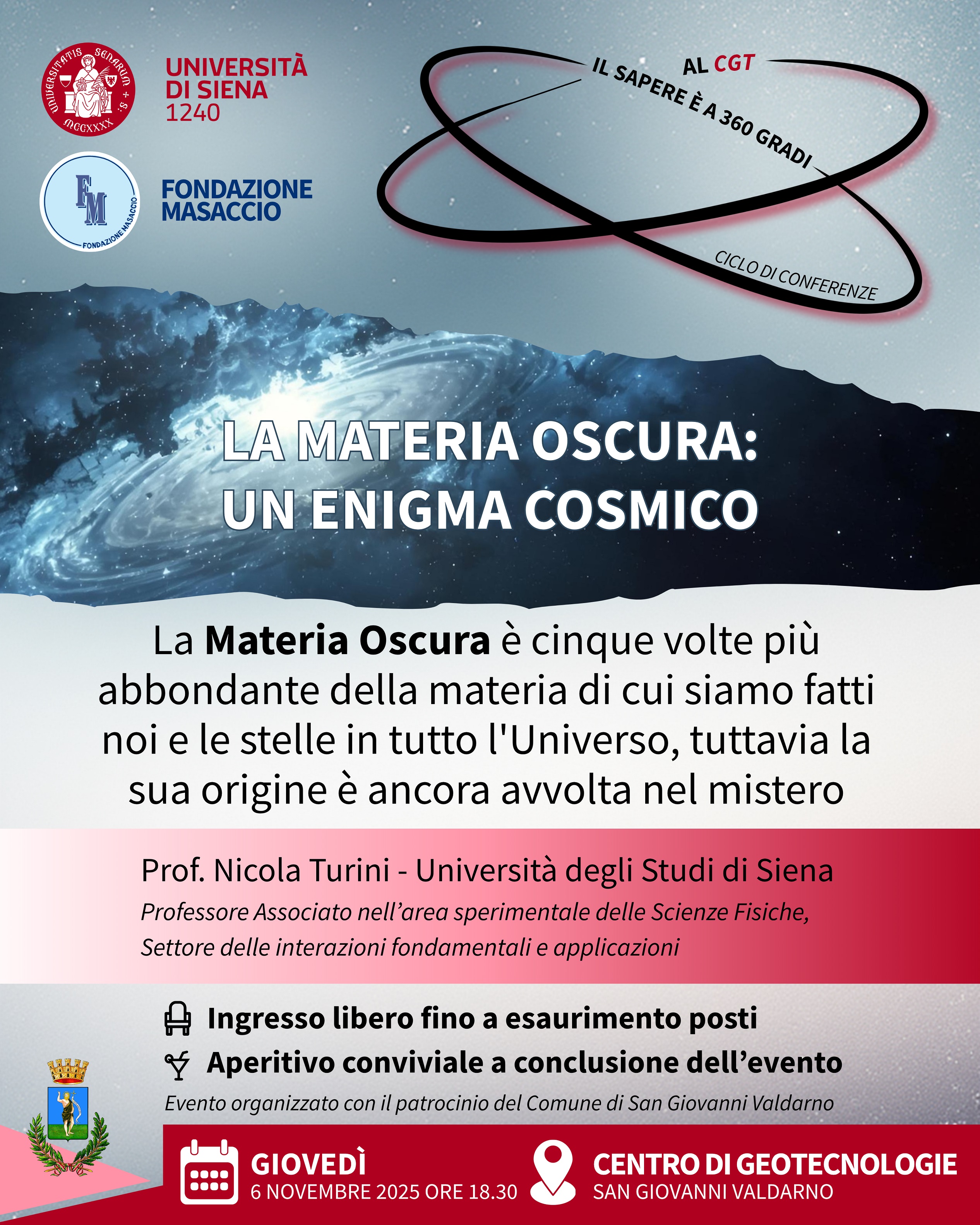Il 6 novembre, alle ore 18.30, nell’Aula magna del Centro di GeoTecnologie dell’Università di Siena (via Vetri Vecchi 34, San Giovanni Valdarno), si terrà la conferenza “La materia oscura: un enigma cosmico” nell’ambito del ciclo di appuntamenti “Al CGT il sapere è a 360 gradi”, pensato per esplorare le molteplici forme della conoscenza e aprirle al grande pubblico.