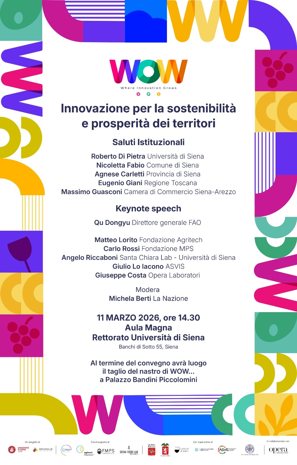 L’evento si inserisce nell’ambito dell’inaugurazione di “WOW… - Wine, Olive Oil, Wheat”, il nuovo spazio dell’Università di Siena dedicato alla bellezza delle filiere agroalimentari e alle innovazioni a supporto del territorio, degli imprenditori e del benessere delle comunità, in programma a Palazzo Bandini Piccolomini al termine del convegno.