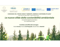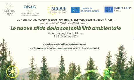 Nei giorni 5 e 6 dicembre 2024 si svolge, presso il Dipartimento di Studi Aziendali e Giuridici (DISAG, presso il complesso didattico San Francesco), il Convegno della Forum “Ambiente, Energia e Sostenibilità” dell’Associazione italiana di diritto dell’Unione europea (AISDUE) dal titolo “Le nuove sfide della sostenibilità ambientale “.