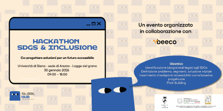 Il 30 gennaio, dalle ore 9 alle ore 18, al campus del Pionta (aula 11, Palazzina Uomini, viale Cittadini, 33 – Arezzo), si terrà l'hackathon "Sdgs & inclusione. Co-progettare soluzioni per un futuro accessibile" per essere protagonista di un vero processo di creazione di una startup.
