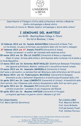 I seminari del martedì, organizzati dal Centro A.M.A. (Antropologia mondo antico) in collaborazione con il dipartimento di Filologia e critica delle letterature antiche e moderne, sono dedicati a mondo classico, antropologia e teoria della cultura.