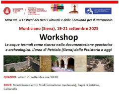 Dal 19 al 21 settembre a Monticiano (Siena) si terrà Workshop: “Le acque termali come risorsa nella documentazione geostorica e archeologica. L’area di Petriolo (Siena) dalla Preistoria a oggi”.