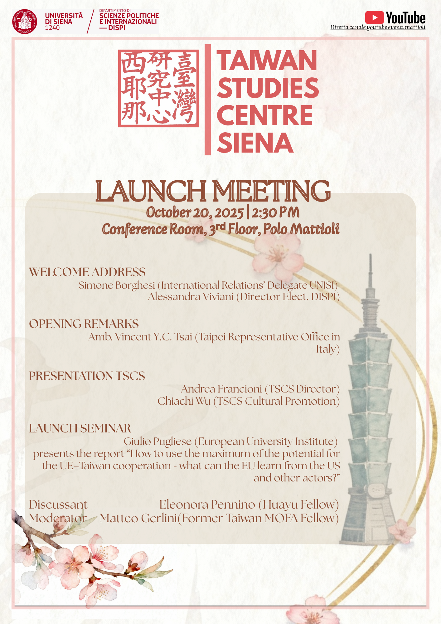 Lunedì 20 ottobre, alle ore 14.30, nella Sala Conferenze del Complesso didattico Mattioli (via Mattioli, 10 – Siena), il dipartimento di Scienze politiche e internazionali inaugura il Taiwan Studies Centre Siena (TSCS) con un incontro aperto alla comunità accademica e alla città.