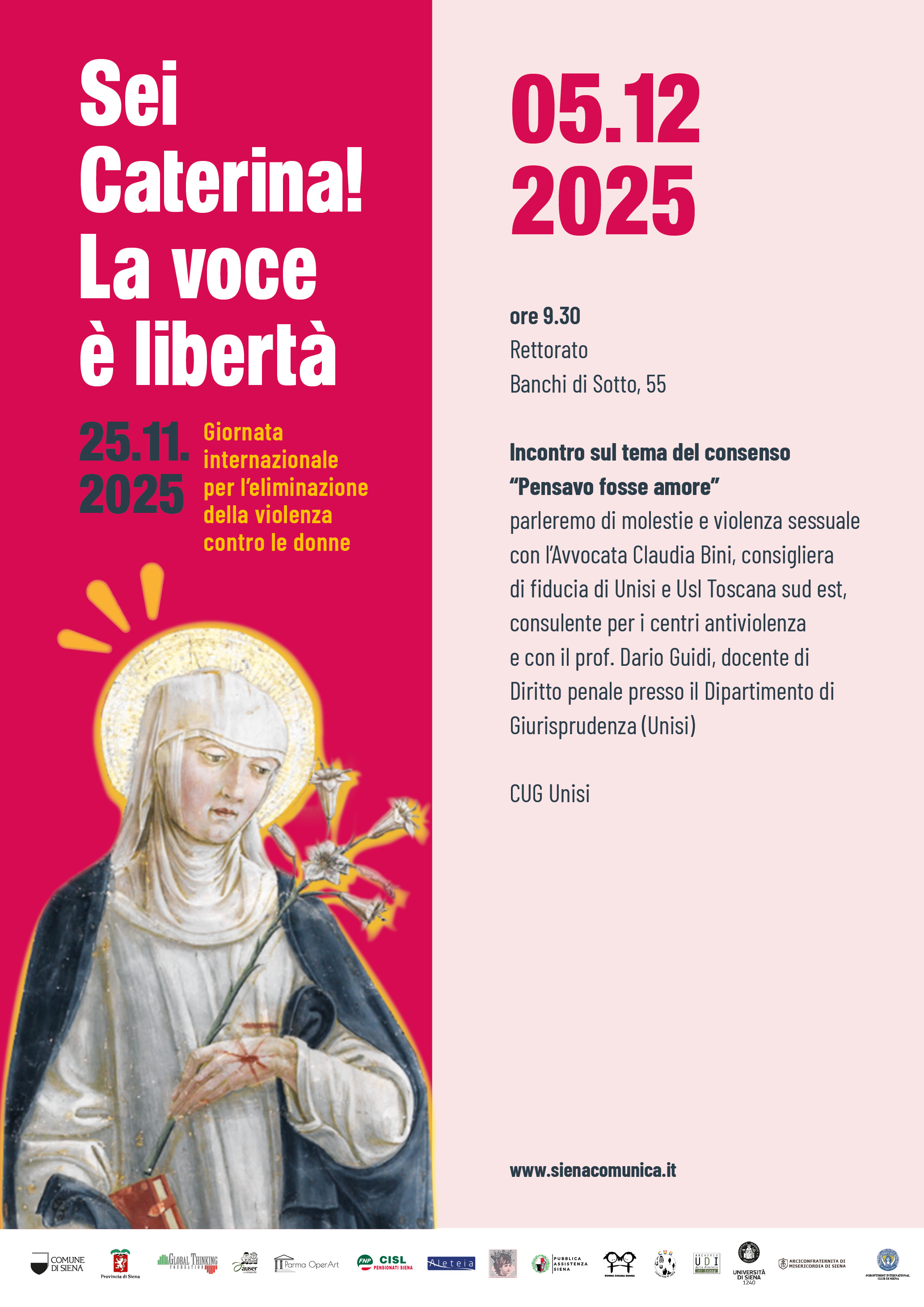 Il 5 dicembre, dalle ore 9.30, nell’Aula Magna storica (Banchi di Sotto, 55 – Siena), si terrà l’incontro “Pensavo fosse amore”, dedicato alle tematiche delle molestie e della violenza sessuale.