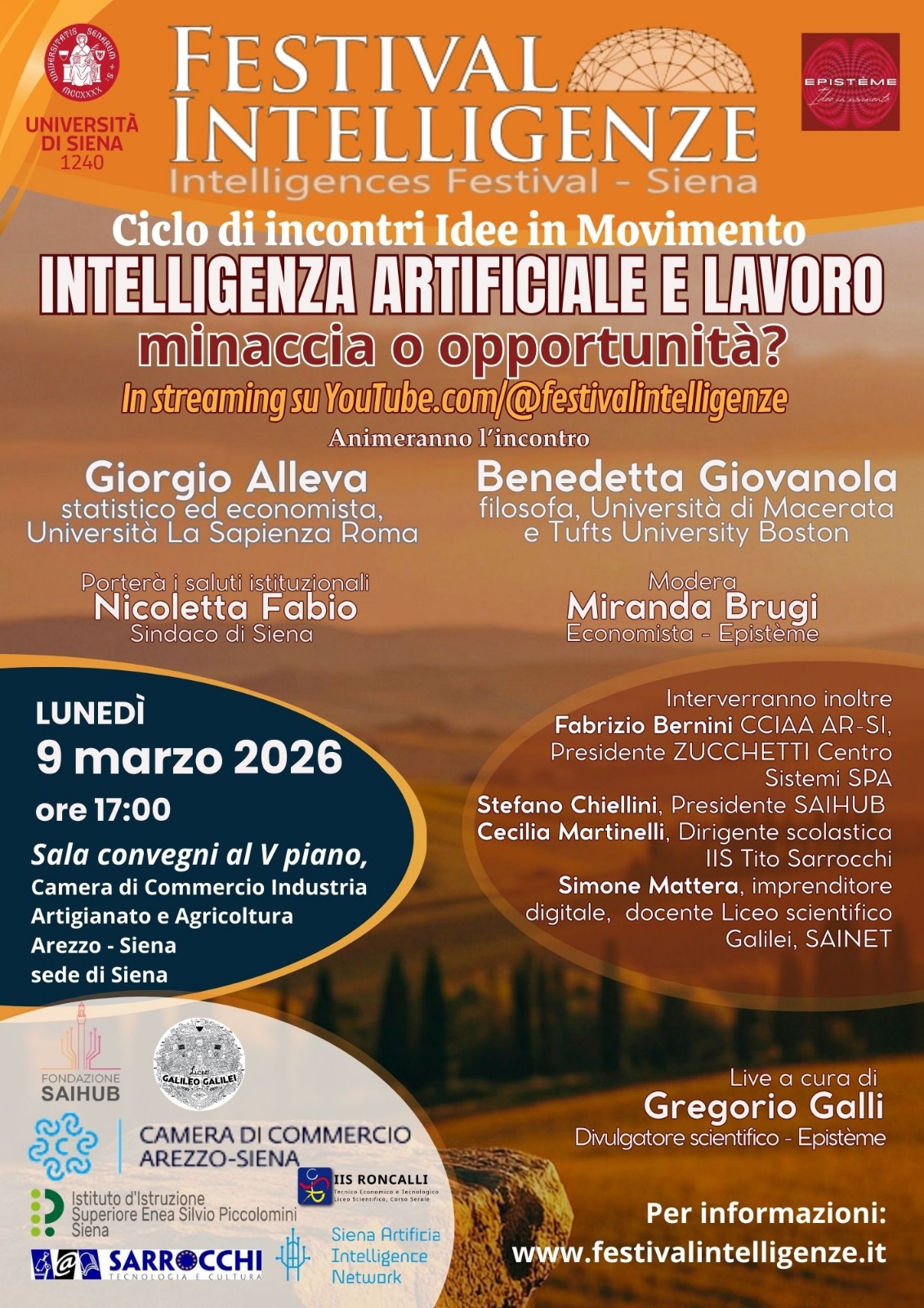 Protagonisti dell’incontro, aperto dai saluti del sindaco di Siena, prof. Nicoletta Fabio, saranno Giorgio Alleva, statistico ed economista dell’Università La Sapienza Roma, già presidente dell’ISTAT e Benedetta Giovanola, filosofa morale, docente presso l’Università di Macerata e la Tufts University Boston, tra le principali voci italiane nel campo dell’etica dell’intelligenza artificiale.