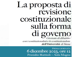Il giorno 6 dicembre alle ore: 12.00 presso l’Aula Magna del Presidio Mattioli si terrà la prima giornata di dibattito con i costituzionalisti e le costituzionaliste dell’Università di Siena dal titolo “La proposta di revisione costituzionale sulla forma di governo”