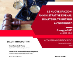 Il 6 maggio, alle ore 15, all’Accademia dei Fisiocritici (piazzetta Silvio Gigli, 2 – Siena), si terrà il convegnoLe nuove sanzioni amministrative e penali in materia tributaria a confronto”.