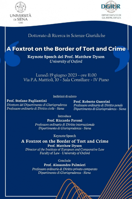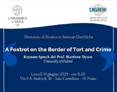 Nell'ambito delle attività formative del Dottorato in Scienze Giuridiche, il 19 giugno 2023, ore 11.00, presso la Sala Consiliare del Dipartimento di Giurisprudenza (Via Mattioli, 10 – IV piano) si terrà una lezione del prof. Matthew Dyson (Director of the Institute for European and Comparative Law, University of Oxford), dal titolo A Foxtrot on the Border of Tort and Crime.