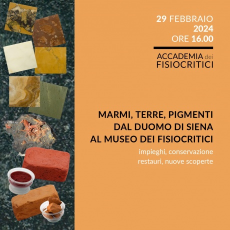 Il 29 febbraio, a partire dalle 16, all’Accademia dei Fisiocritici, si terrà il convegno “Marmi, terre, pigmenti dal Duomo di Siena al Museo dei Fisiocritici”.
