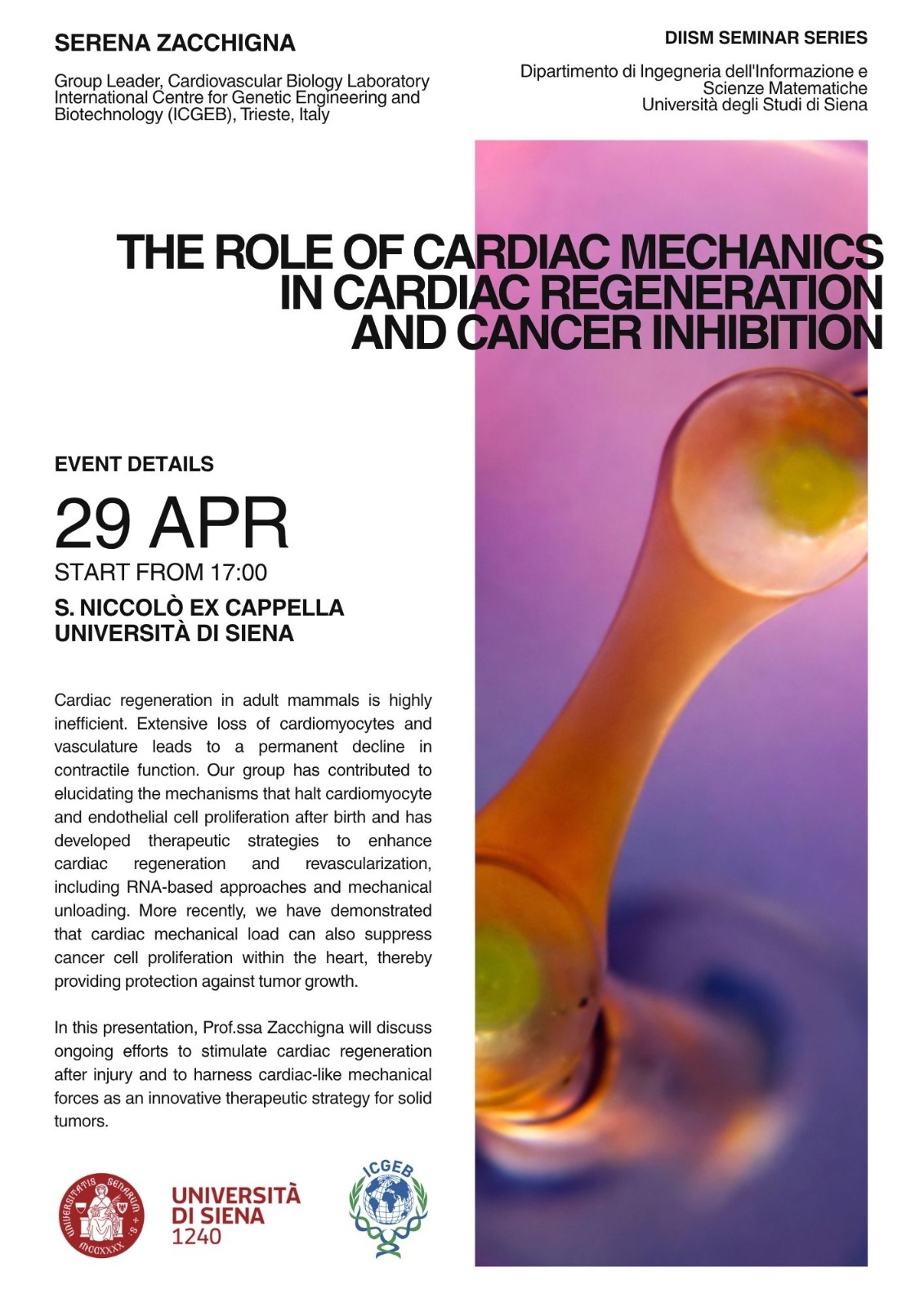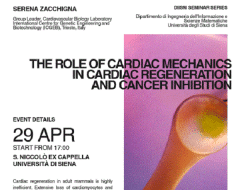 Il mercoledì 29 aprile dalle ore 17. 00 presso il Complesso didattico San Niccolò – Ex Cappella la Prof.ssa Serena Zacchigna terrà il seminario dal titolo: Il ruolo della meccanica cardiaca nella rigenerazione del cuore e nell’inibizione del cancro