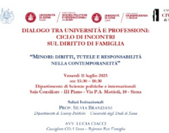 L’11 luglio, alle 15.30, nella Sala Consiliare del Complesso didattico Mattioli (via Mattioli, 10 – Siena), si terrà l’incontro "Minori: diritti, tutele e responsabilità nella contemporaneità", promosso dai dipartimenti di Scienze politiche e internazionali e di Giurisprudenza dell’Università di Siena insieme alla Camera Civile di Siena.