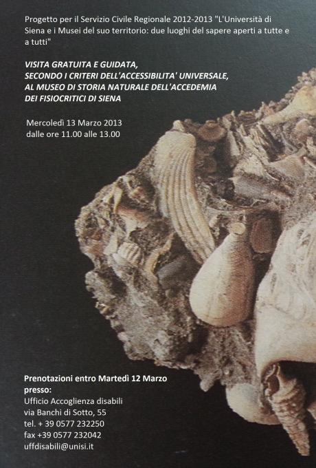 La visita guidata al museo di Storia naturale dell'Accademia dei Fisiocritici, prevista dalle 11 alle 13, si terrà secondo i criteri dell'accessibilità universale. Un'opportunità per scoprire le collezioni del nuovo percorso museale allestito nel Museo ma anche per conoscere attraverso l'esperienza diretta il tema dell'accessbilità universale.
