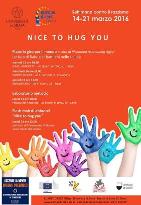 "Nice to hug you" è il nome dell'iniziativa che il Centro Europe Direct di Siena dell'Università di Siena, in collaborazione con l'UNAR – Ufficio Nazionale Antidiscriminazioni Razziali, il Comune di Siena e il DSU – Azienda Regionale per il Diritto allo Studio Toscana, organizza nell'ambito della "Settimana d'azione contro il razzismo", in programma dal 14 al 21 marzo.