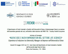 Il Dipartimento di Studi Aziendali e Giuridici dell’Università di Siena e Federmanager Siena in occasione dell’assemblea generale dei soci, nell’ambito delle iniziative del PNRR THE - Tuscany Health Ecosystem invitano al Convegno “NUOVE IDEE E NUOVI IMPRENDITORI NEL SETTORE LIFE SCIENCES”.
