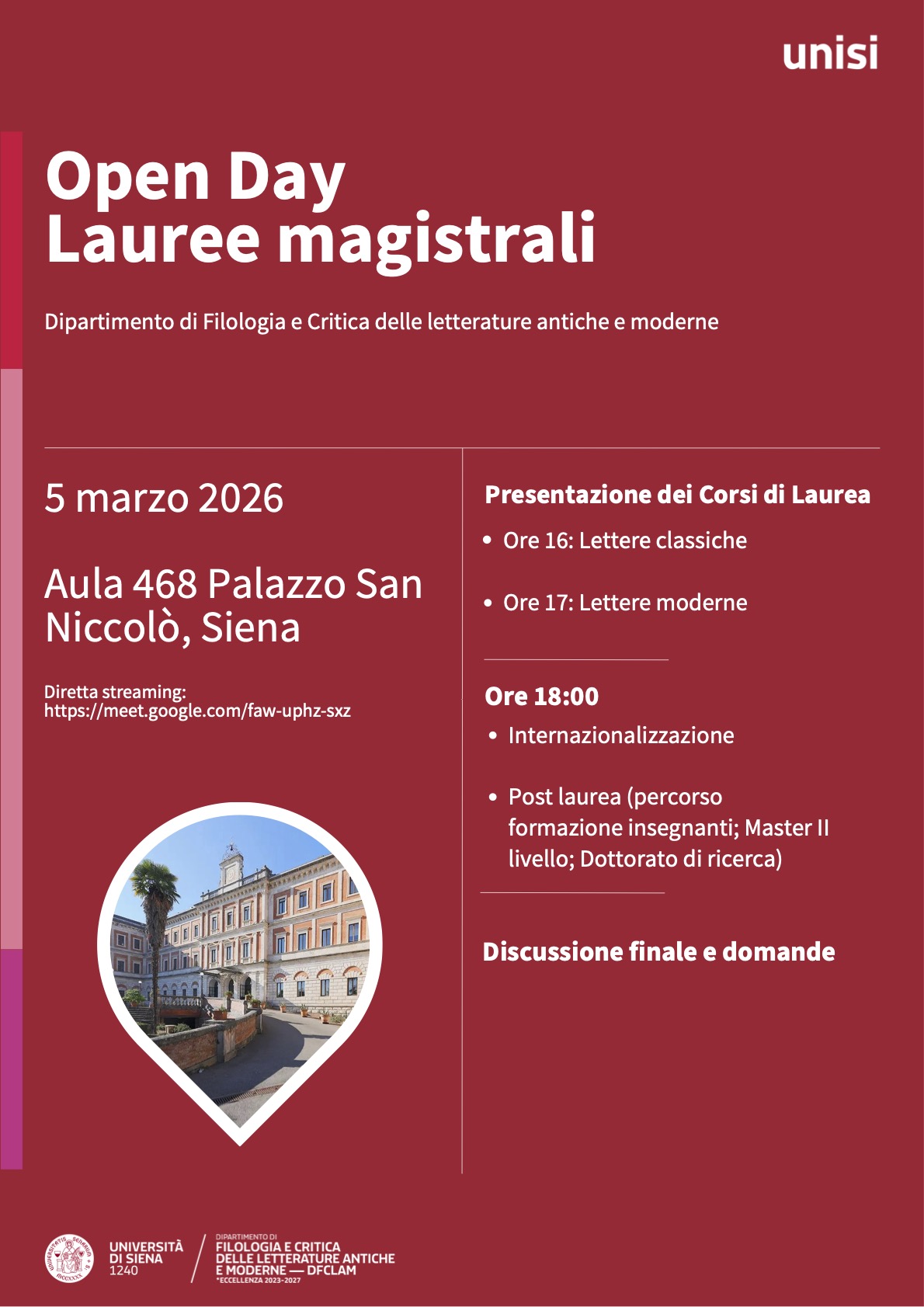 Il 5 marzo alle ore 16.00 nell'Aula 468 del Polo didattico San Niccolò (Via Roma, 56 - Siena) si terrà l'Open Day per i corsi di laurea magistrale del Dipartimento di Filologia e critica delle letterature antiche e moderne (DFCLAM).