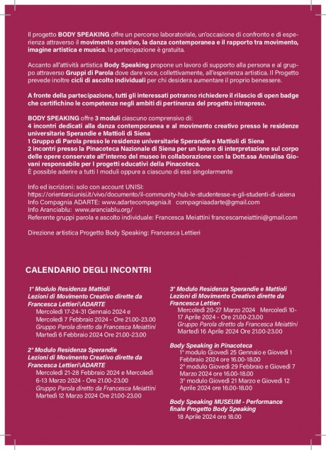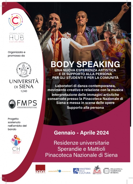 Il 28 novembre, alle ore 17.30, nella Cappella Complesso didattico San Niccolò, si terrà l’Open Day del progetto "Body Speaking", un’occasione di confronto e di esperienza attraverso ilmovimento creativo, la danza contemporanea e il rapporto tra movimento e musica.