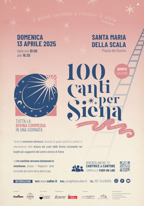 Inoltre, domenica 13 aprile, dalle 10 alle 16.30, torna “100 Canti per Siena”, quinta edizione della maratona dantesca, per la prima volta all'interno del complesso museale di Santa Maria della Scala: un'esperienza sorprendente che rende contemporaneo l'inesauribile valore della poesia dantesca restituendola alla dimensione popolare e corale. “100 Canti per Siena” è ideato dall’associazione Culter, con il contributo del Comune di Siena.