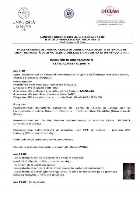 Presentazione del Corso di Laurea, erogato congiuntamente dalla sede di Arezzo dell'Università di Siena e dal College of International Education e dalla School of Foreign Languages dell’Università di Wenzhou.