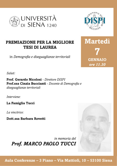 Il 7 gennaio 2025, alle ore 11.30. al Complesso didattico Mattioli, Università di Siena, si terrà la consegna del premio di laurea dedicato alla memoria del Prof. Marco Paolo Tucci, docente di Economia politica dell’Università di Siena scomparso il 24 dicembre 2023.