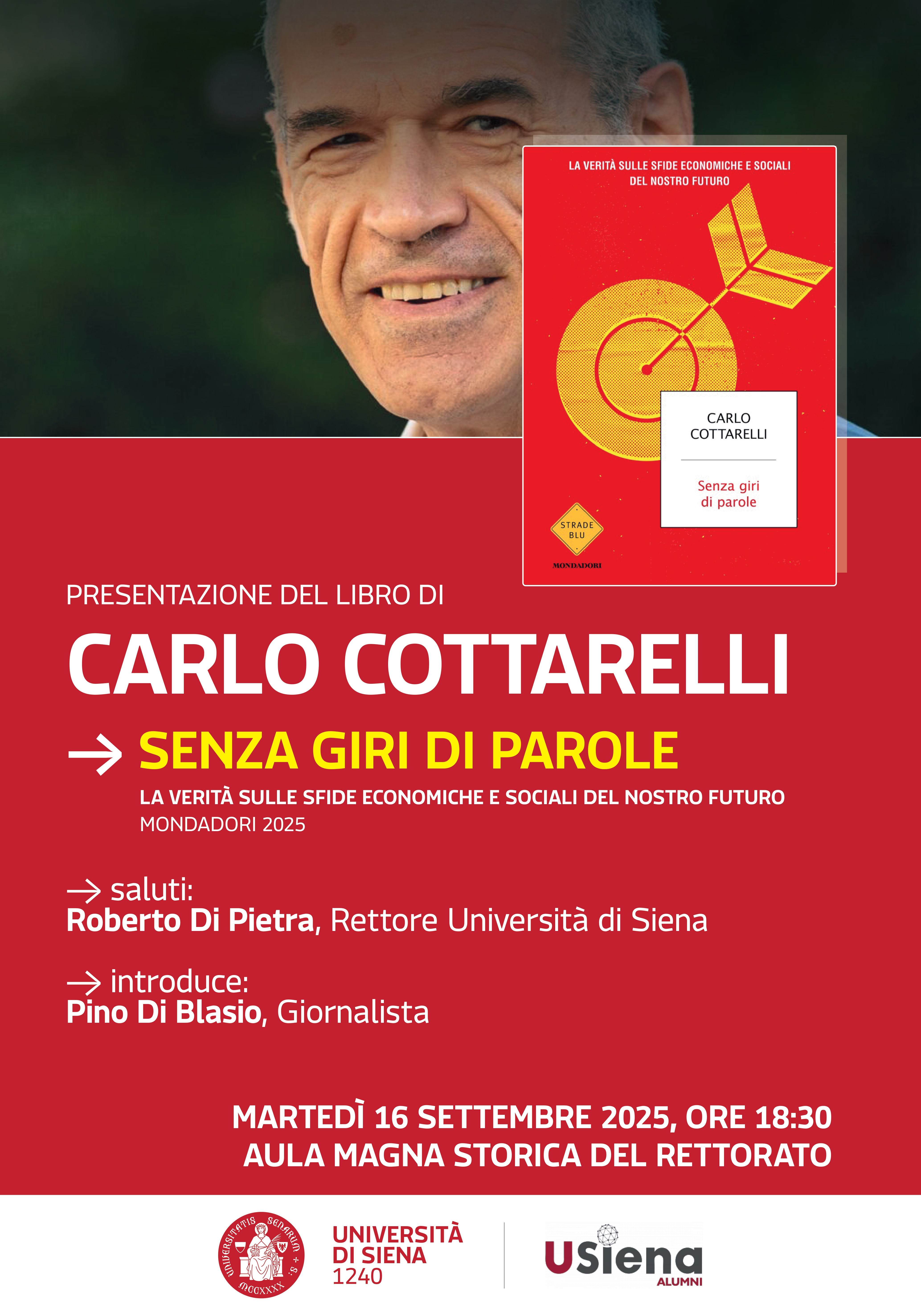Sarà un nuovo ritorno nella “sua” Università quello dell’economista Carlo Cottarelli, che martedì 16 settembre, alle ore 18:30, presenterà nell’Aula Magna Storica del Rettorato il suo ultimo libro “Senza giri di parole. La verità sulle sfide economiche e sociali del nostro futuro”, pubblicato da Mondadori a maggio di quest’anno. Organizzata dall’Ateneo senese in collaborazione con USiena Alumni e URadio, la presentazione sarà aperta dal saluto del Rettore Roberto Di Pietra e dall’introduzione del giornalista Pino Di Blasio. Subito dopo, l’autore illustrerà la sua analisi sulle sfide che stanno modellando il futuro economico della nostra società, in un confronto aperto al dialogo con il pubblico presente. Alla fine, Carlo Cottarelli resterà a disposizione di chi vorrà farsi autografare una copia del volume.