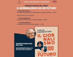 L’8 maggio, alle ore 14.30, Aula A-B del Complesso didattico San Niccolò (via Roma, 47 – Siena), si terrà la presentazione del libro "Il giornalismo ha un futuro" (“il Mulino”) di Carlo Sorrentino, ordinario di Sociologia dei processi culturali e “Giornalismo e sfera pubblica all’Università di Firenze.
