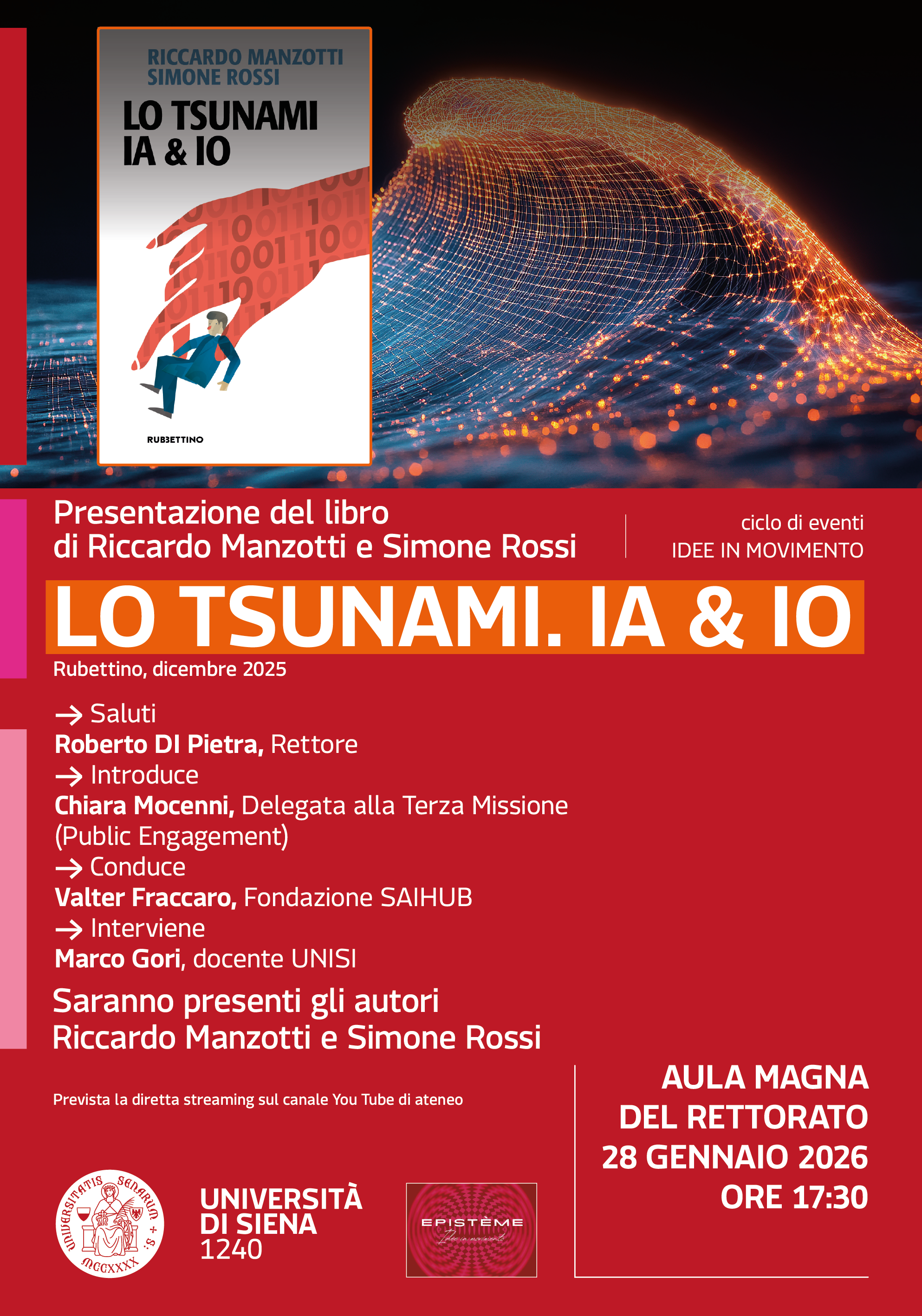 Il 28 gennaio, alle ore 17.30, in Aula magna del Rettorato (Banchi di Sotto, 55 – Siena), si terrà la presentazione del libro di Riccardo Manzottidocente di Filosofia teoretica allo IULM, e Simone Rossiprofessore di Neurofisiolgia all’Università di Siena, dal titolo "Lo tsunami. IA & IO" (Rubettino, dicembre 2025).