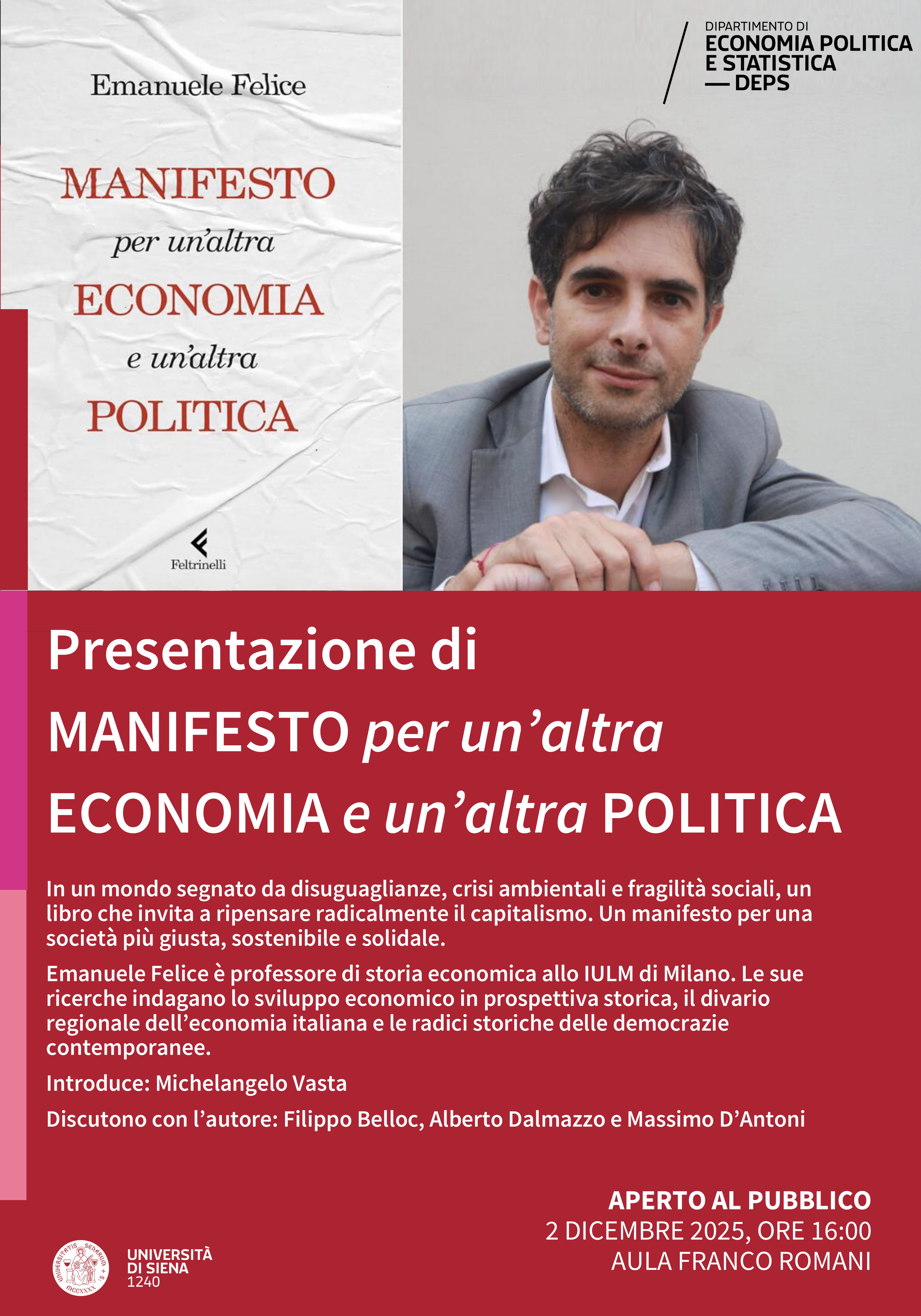 Il 2 dicembre, alle ore 16, in aula F. Romani del Complesso didattico San Francesco (piazza San Francesco, 7 – Siena), si terrà la presentazione del libro "Manifesto per un'altra Economia e un'altra Politica", di Emanuele Felice, docente di Storia economica allo Iulm di Milano.