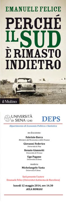 Il 12 maggio, alle ore 14.30, presso l'aula Romani del dipartimento di Economia politica e statistica, si terrà la presentazione del volume "Perché il sud è rimasto indietro" (Il Mulino, 2014), di Emanuele Felice (Universitat Autònoma de Barcelona), alla presenza dell'autore.