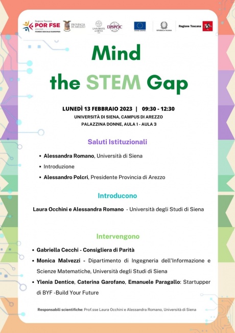 Il 13 febbraio 2023, a partire dalle ore 9.30, presso il Campus del Pionta, sede di Arezzo, dell’Università di Siena, prenderà il via la parte formativa del progetto “Mind the STEM Gap”, che coinvolgerà circa 200 studenti delle classi III° e IV°, degli Istituti superiori, provenienti dal territorio aretino.