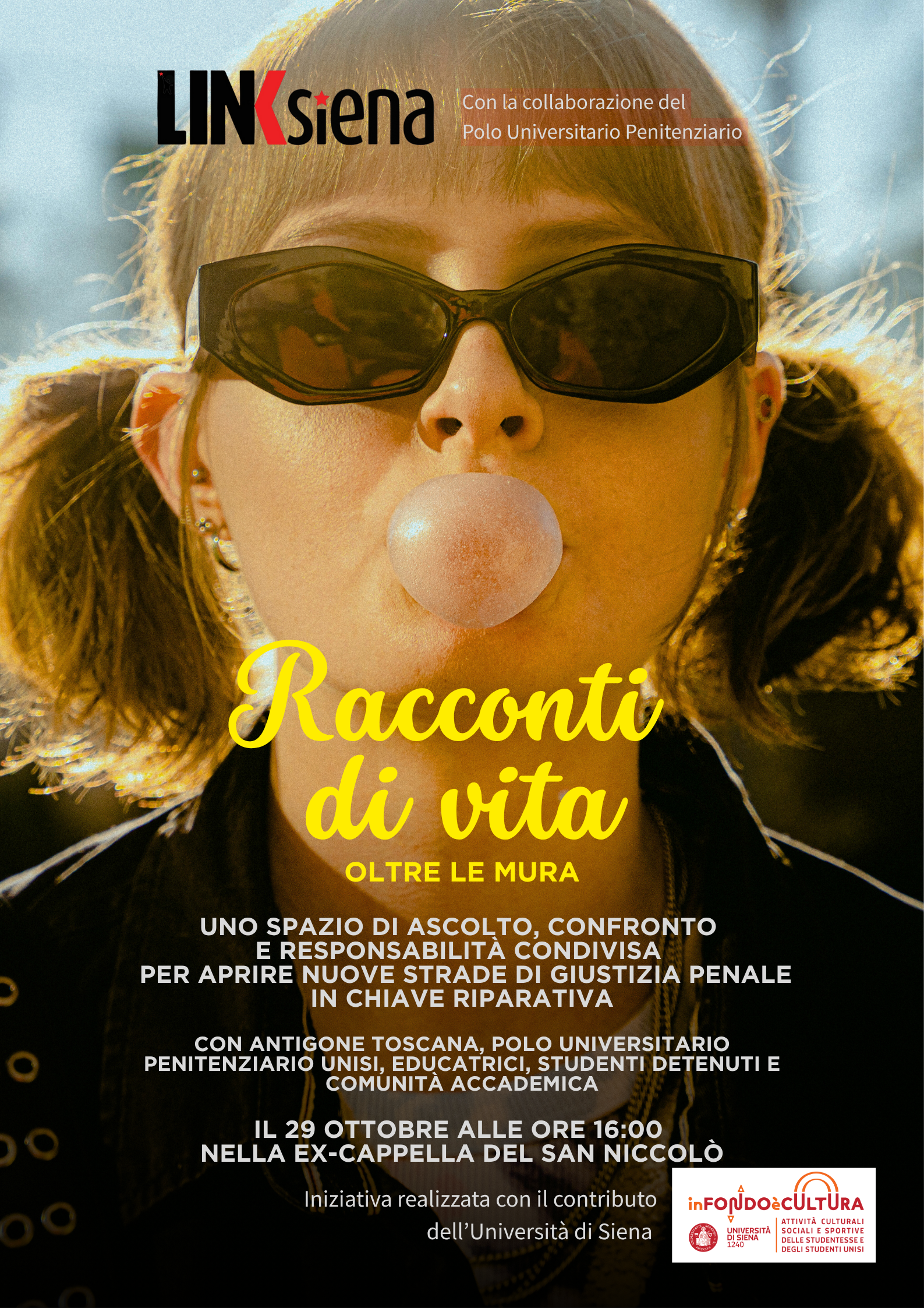 Il progetto Racconti di vita. Oltre le mura nasce dall’urgenza di riportare il dibattito sulla giustizia sociale nella comunità, al di fuori delle mura carcerarie. Organizzato dall’Associazione studentesca Link Siena con la collaborazione del Polo Universitario Penitenziario come incontro pubblico, si terrà mercoledì 29 ottobre p.v. alle ore 16.00 nella Sala Ex Cappella presso il Presidio Universitario di San Niccolò, in via Roma 56 a Siena.