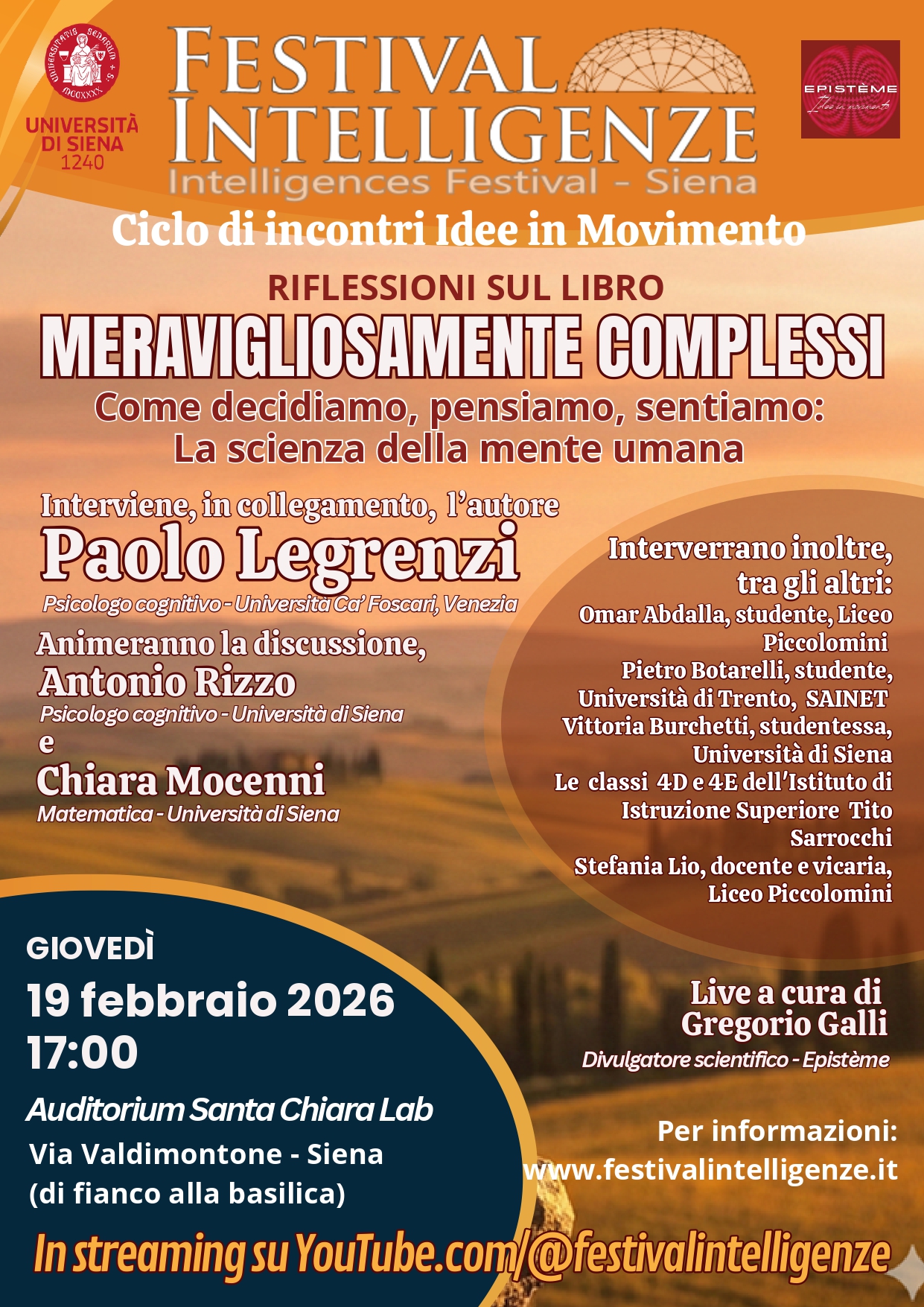 A partire dai temi che si intrecciano nel volume, Legrenzi dialogherà con Chiara Mocenni, matematica dell'Università di Siena esperta di modelli e sistemi complessi e con Antonio Rizzo, psicologo cognitivo dello stesso ateneo studioso dei processi cognitivi e del comportamento umano, in un confronto interattivo con studenti e docenti delle scuole medie superiori, studenti universitari e pubblico.