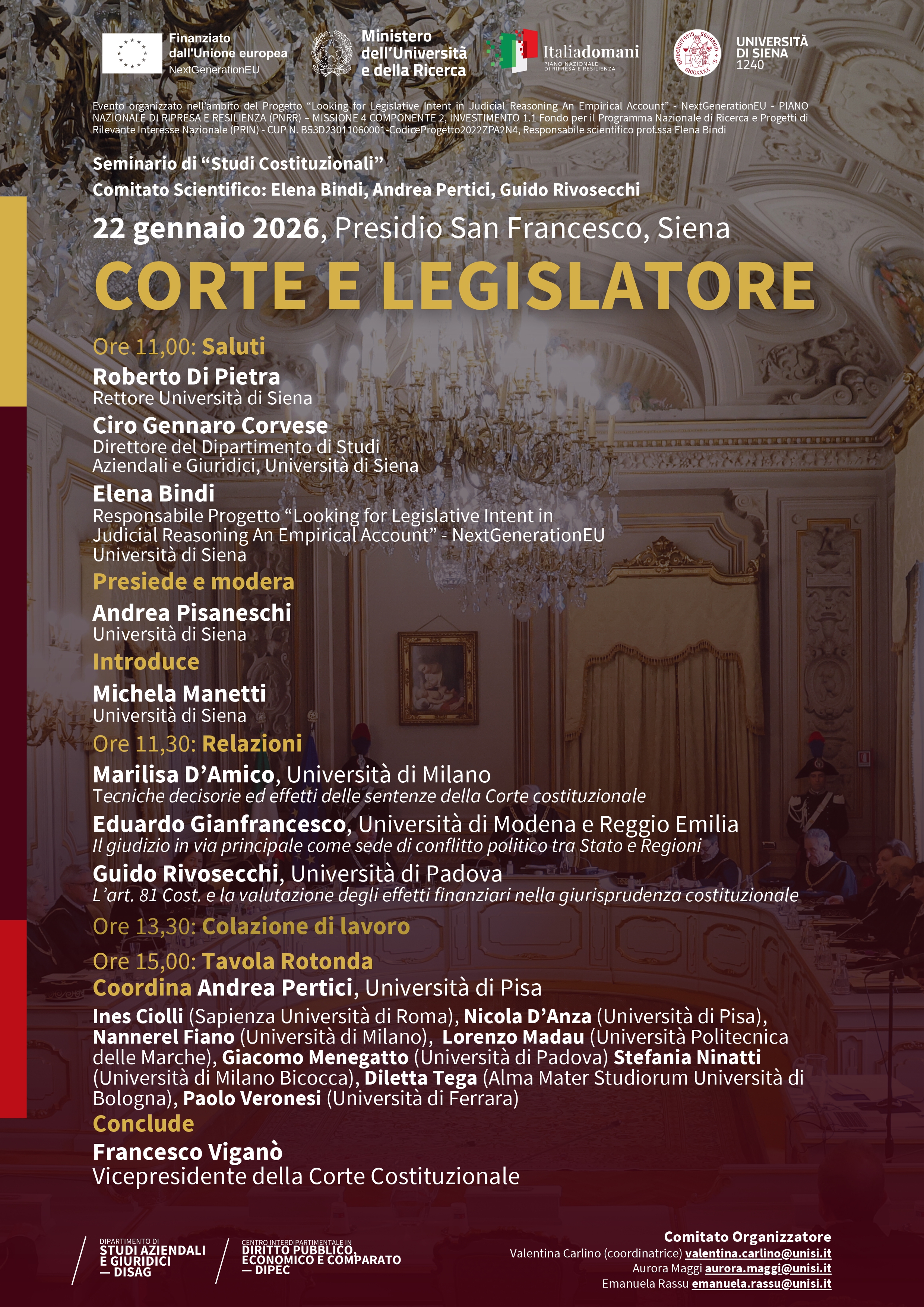 Il 22 gennaio 2026, a partire dalle 11, in aula Franco Romani del Presidio San Francesco, si terrà il seminario “Corte e Legislatore”, evento conclusivo del Progetto di ricerca PRIN 2022 “Looking for Legislative Intent in Judicial Reasoning – An Empirical Account”, coordinato per l'Università di Siena dalla professoressa Elena Bindi (DISAG).