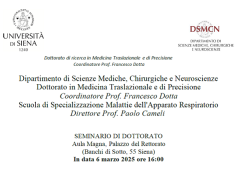 Il seminario è frutto di una importante collaborazione scientifica ed è legato al Dottorato di ricerca in Medicina traslazionale e di Precisione e alle attività seminariali del Dipartimento di Scienze Mediche Chirurgiche e Neuroscienze (SMCN). Questo evento rappresenta un'opportunità unica di aggiornamento e confronto anche per i nostri medici in formazione presso la Scuola di Specializzazione in Malattie dell'apparato respiratorio.