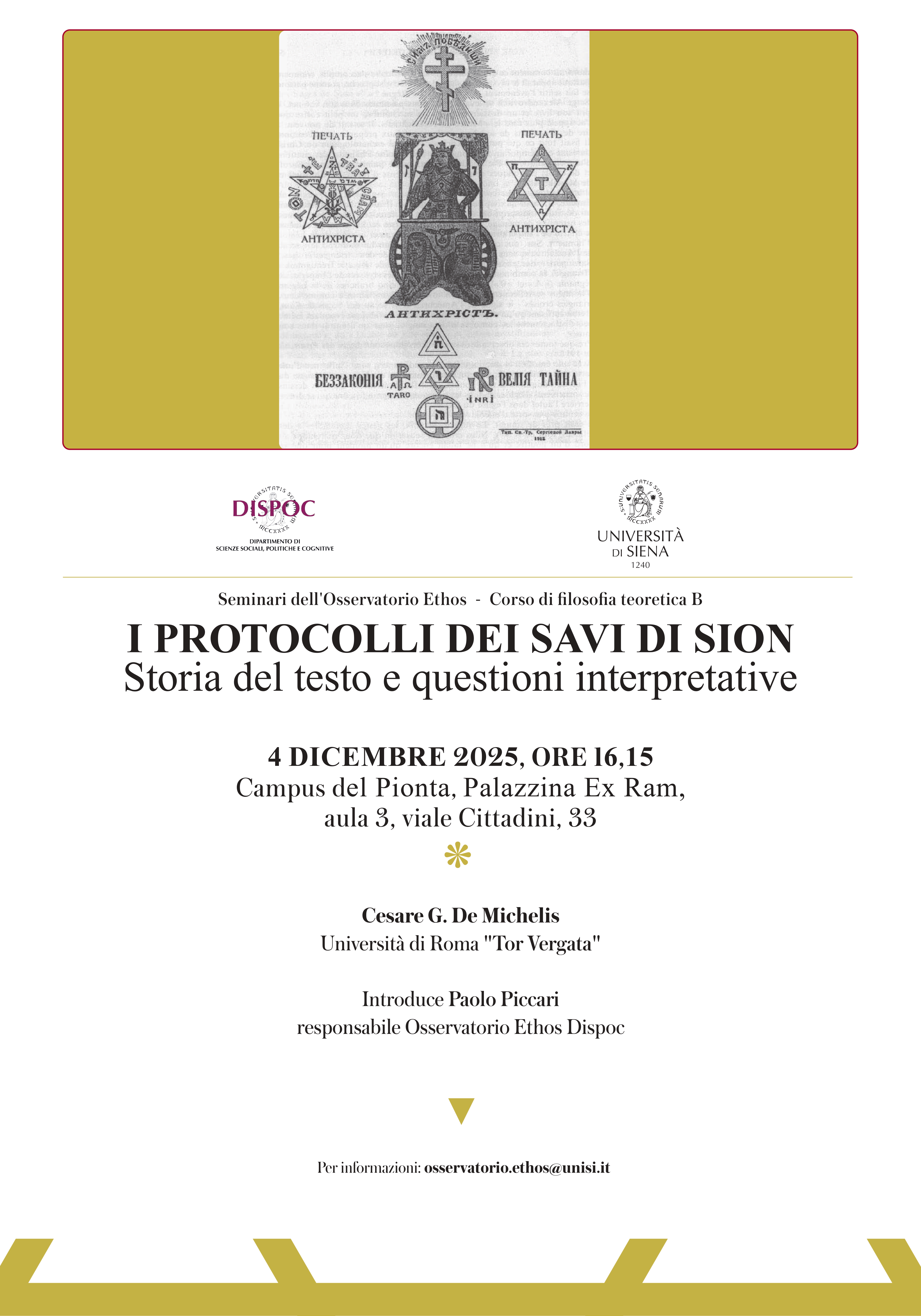 Il 4 dicembre, alle 16.15, nell’aula 3 della Palazzina Ex Ram del Campus del Pionta di Arezzo (viale Luigi Cittadini, 33 – Arezzo), si terrà il seminario dedicato ai Protocolli dei Savi di Sion, un noto e grossolano falso storico redatto in Russia all’inizio del XX secolo, che continua ancora oggi a essere utilizzato come strumento della propaganda antisemita.