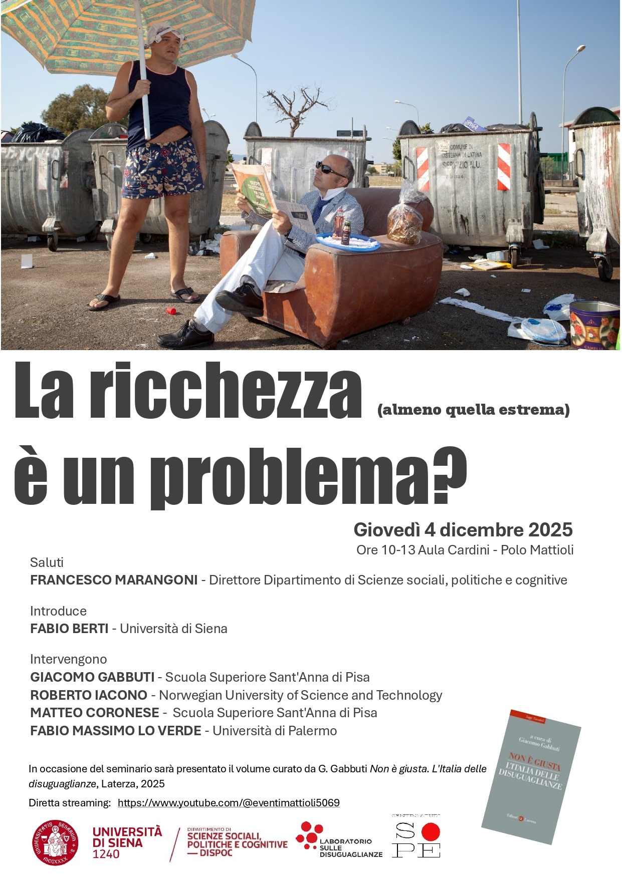 Dopo i saluti istituzionali di Francesco Marangoni, direttore del DISPOC, e l’introduzione di Fabio Berti, Ordinario di Sociologia dell’Università di Siena), interverranno: Giacomo Gabbuti e Matteo Coronese della Scuola Superiore Sant’Anna di Pisa, Roberto Iacono della Norwegian University of Science and Technology e Fabio Massimo Lo Verde dell’Università di Palermo.