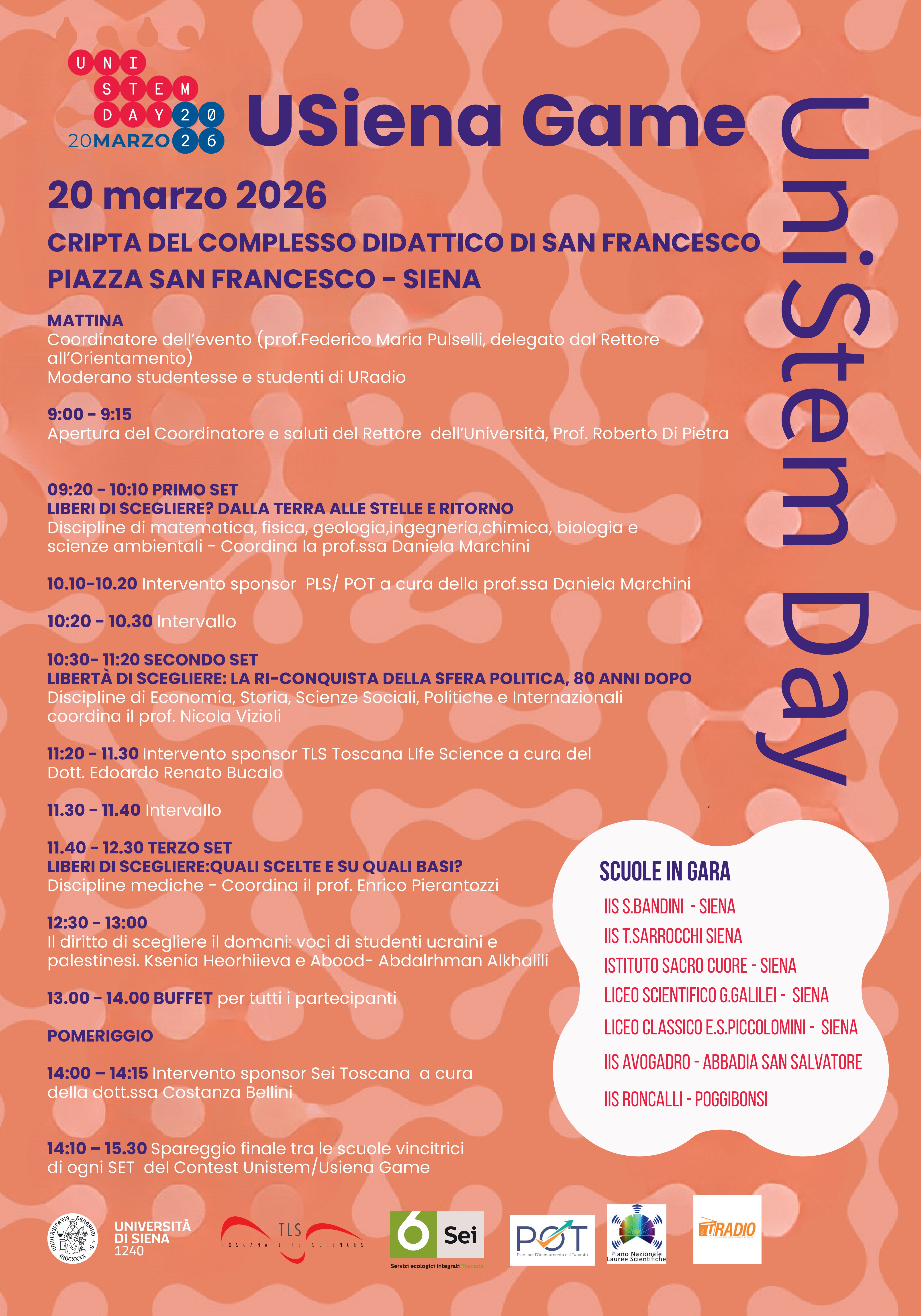 L'iniziativa, che si concluderà con lo spareggio finale tra le scuole vincitrici di ogni set del contest Unistem/USiena Game, è promossa da Università di Siena, Toscana Life Sciences, Sei Toscana, Piani per l’Orientamento e il Tutorato, Piano Nazionale Lauree Scientifiche e uRadio, la radio della comunità studentesca dell’Università di Siena.