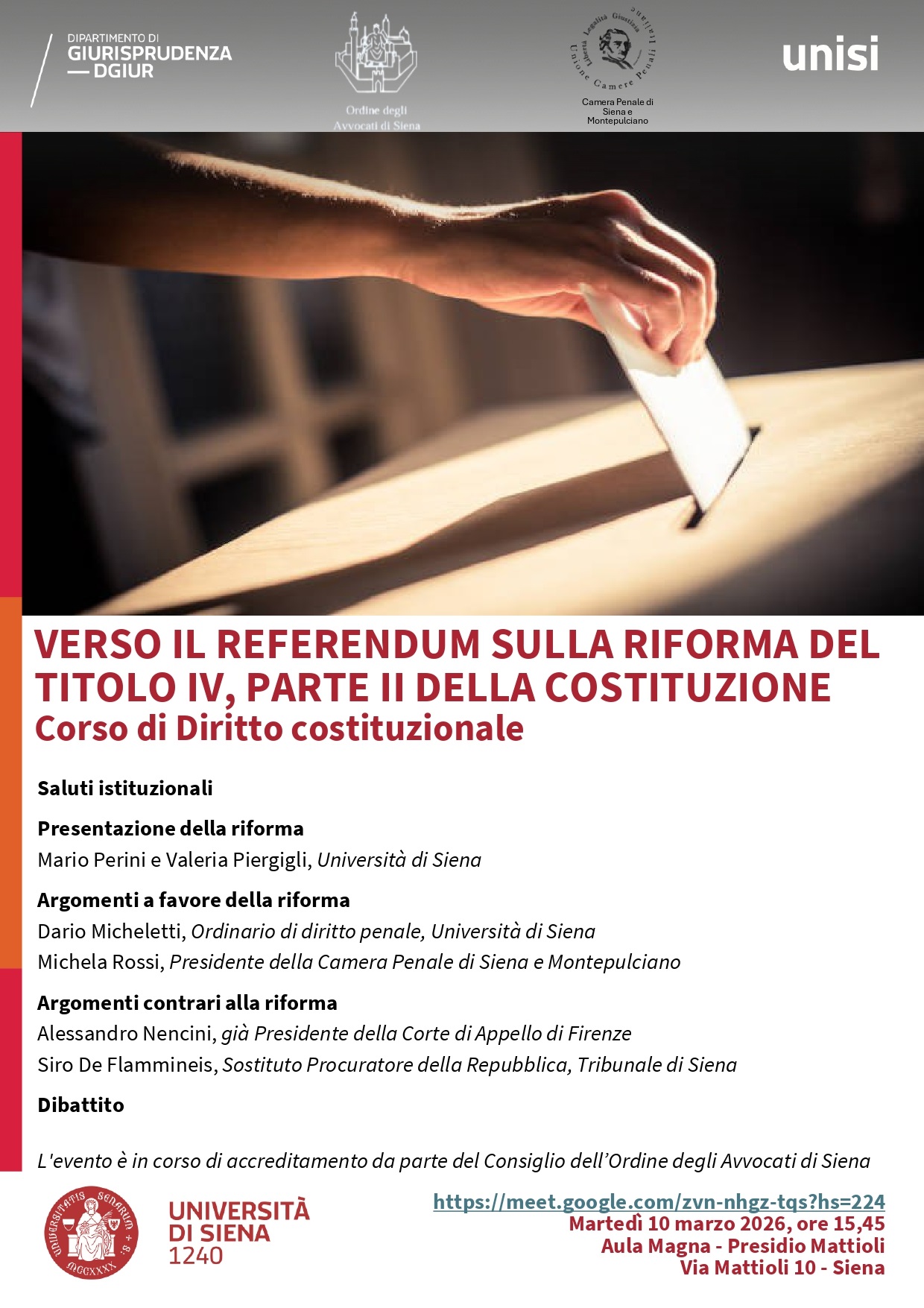 Il 10 marzo, alle 15.45, nell’Aula magna del Complesso didattico Mattioli (via Mattioli, 10 – Siena), si terrà il convegno “Verso il referendum sulla riforma del Titolo IV, Parte II della Costituzione".