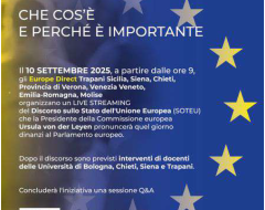 Il programma prevede: live streaming da Strasburgo, collegamento tra sedi, introduzione al SOTEU e dialogo tra docenti. Seguirà uno spazio aperto alle domande del pubblico.L’iniziativa aperta a tutti e tutte consisterà nell’ascolto del discorso in collegamento con il Parlamento Europeo insieme ad altre Europe Direct, consiglieri TED e BELC.