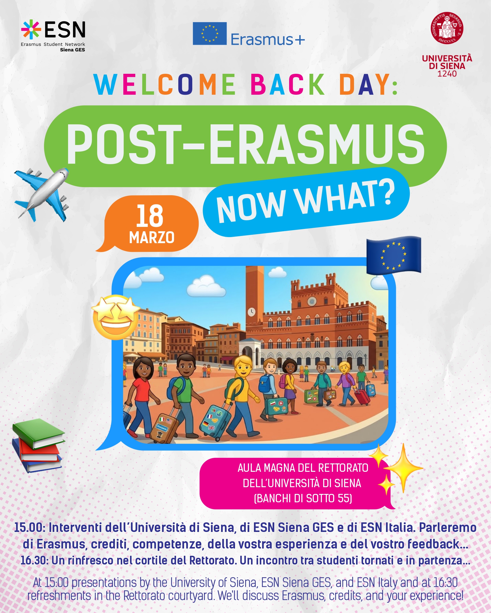 3. Feedback e Spirito Erasmus: a cura di ESN Siena, un momento per raccogliere le vostre impressioni e scoprire come restare attivi nella community attraverso il progetto "students helping students".